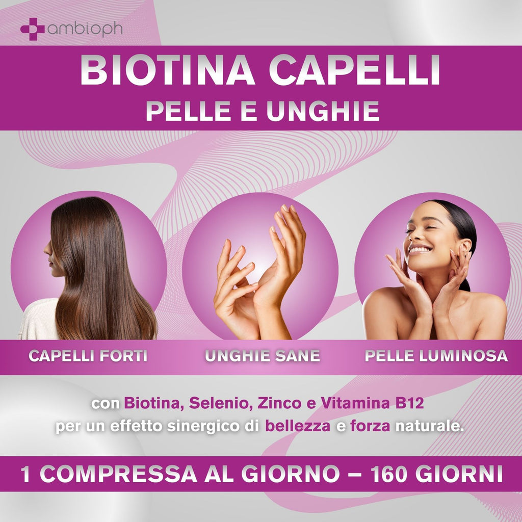 • INTEGRATORE CAPELLI DONNA – Ideale come integratore capelli donna, Biotina Capelli Advanced Ambioph è studiato per soddisfare le esigenze di donne e uomini che desiderano rinforzare i capelli fragili, migliorare la lucentezza e proteggere unghie e pelle. La formula Made in Italy con Biotina, Zinco, Selenio e Vitamina B12 assicura qualità, sicurezza e un trattamento continuativo di oltre 5 mesi, con 1 compressa al giorno.