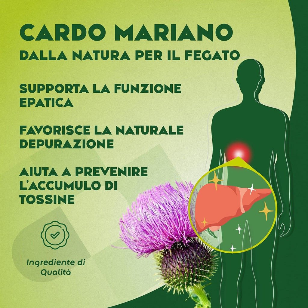 - CARDO MARIANO: Capsule di Cardo Mariano ad alto dosaggio con estratto titolato all’80% in silimarina, arricchite con carciofo e tarassaco per un supporto completo alla funzione epatica e al metabolismo dei grassi. Una formula naturale studiata per favorire la depurazione del fegato, sostenere la digestione e contribuire al benessere generale dell’organismo. Ideale come trattamento quotidiano di detox, depurazione o programma di purificazione, questo complesso vegetale unisce efficacia e qualità, garantendo un sostegno mirato alla salute del fegato.
